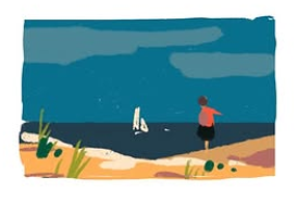 Je commence par faire des toutes petites esquisses directement en couleur, pour poser rapidement les ambiances et les compositions. Ensuite, je construis l’image en posant les masses colorées, de l’arrière-plan vers le premier plan.