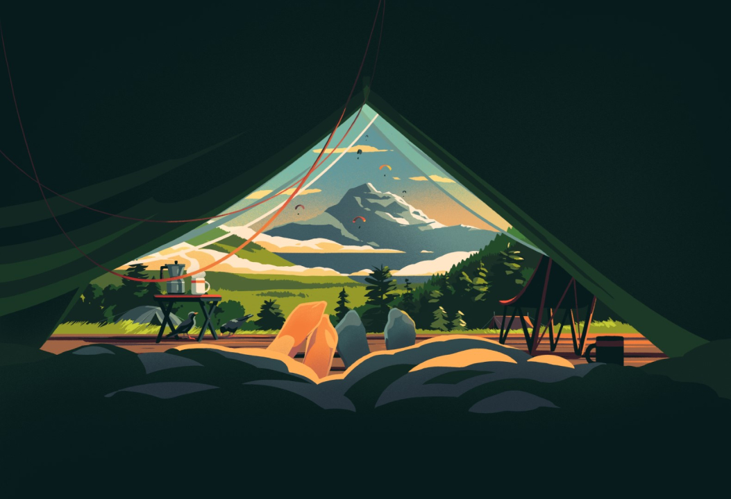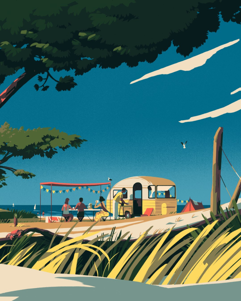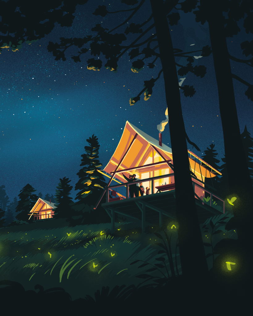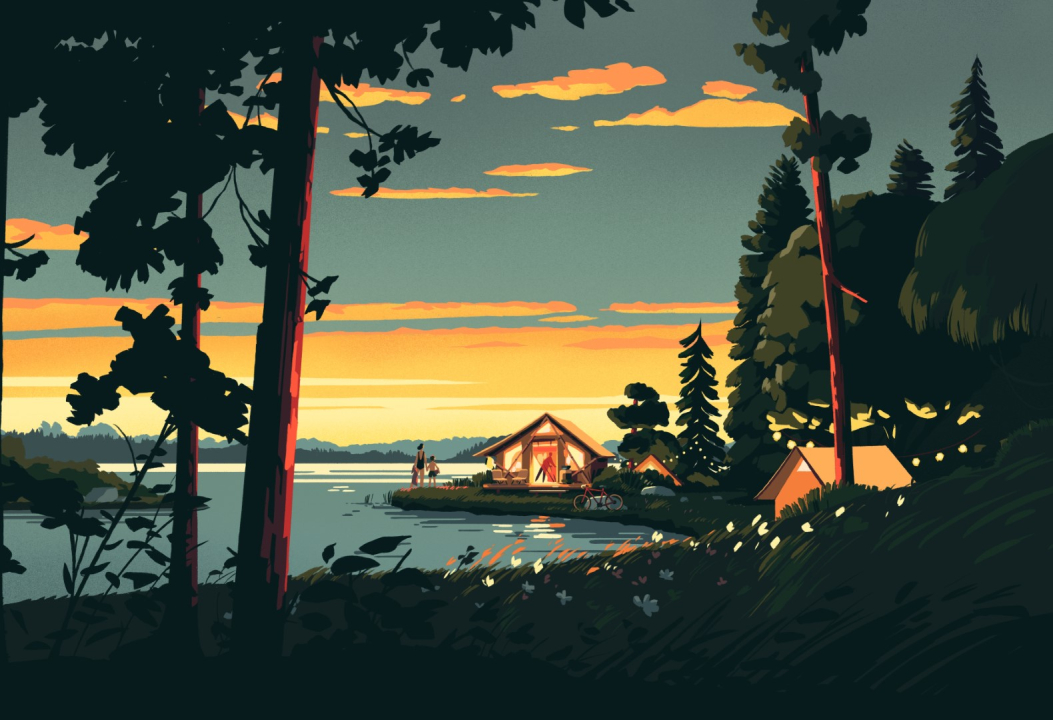 Si l’on se réveillait dans une de tes illustrations Huttopia, qu’est-ce qu’on verrait en premier ?